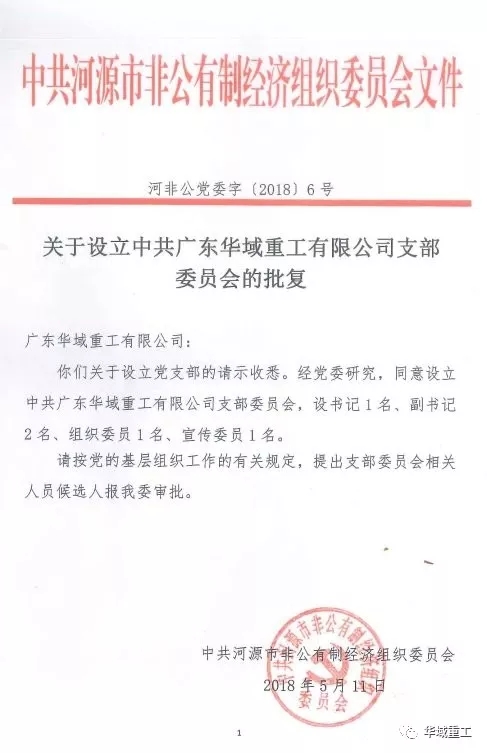 禮畢,由非公有制經濟組織委員會黨辦劉宇凡同志宣讀了《關于設立中共廣東華重工有限公司支部委員會的批復》。