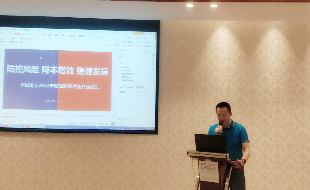 此次會議由華域重工副總經理吳志鴻主持.會議伊始,華域重工總經理趙付欣做了開題報告。他提出:在疫情沖擊疊加國際沖突造成的經濟形勢艱難且充滿不確定的大環境之下,“穩”字當頭;面對民營房企接連出現的嚴重債務危機,加強風險防控才能生存;要在競爭日益激烈的行業中立足,降本增效是必要措施。