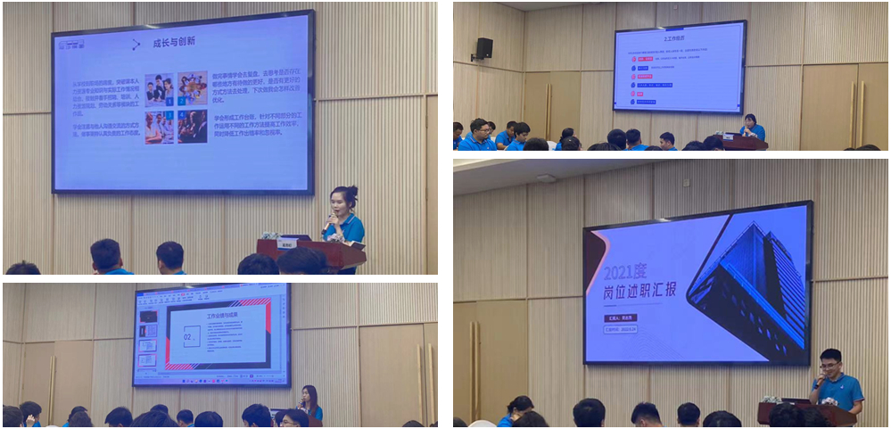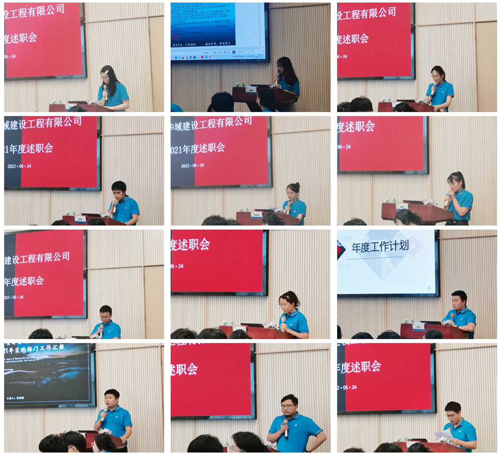 此次述職會采用了自愿報名的原則,根據報名參會員工的崗位分成施工-安全組、技術-成本組、資料-采購-電工組、職能四個小組,四組員工逐一登場,對自己2021年度的工作做了詳細回顧和深刻總結。