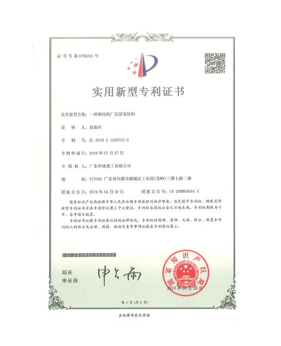 一種鋼結(jié)構(gòu)廠房的屋頂結(jié)構(gòu)專利證書