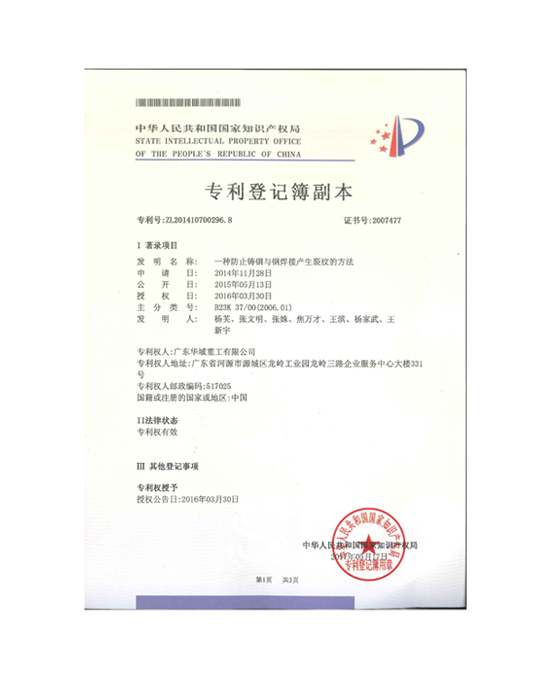 一種防止鑄鋼與鋼焊接產(chǎn)生裂紋的方法專利證書