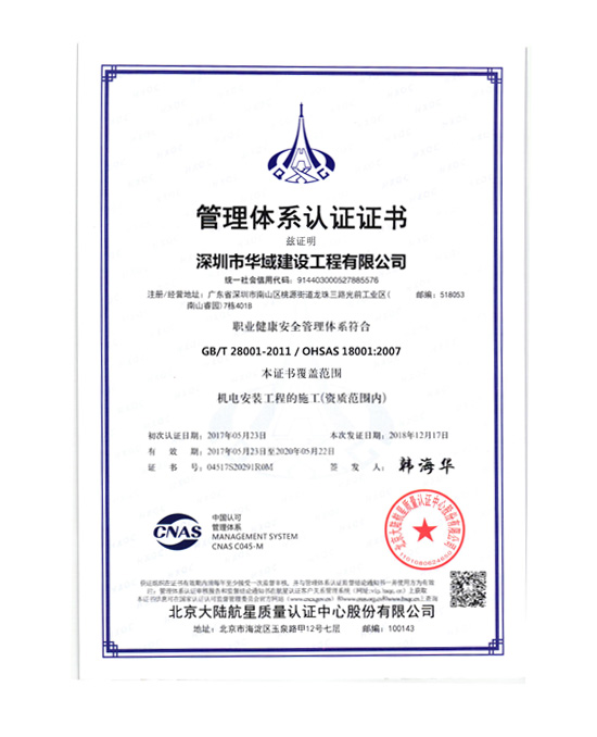 華域建設(shè)OHSAS18001職業(yè)健康管理體系認(rèn)證